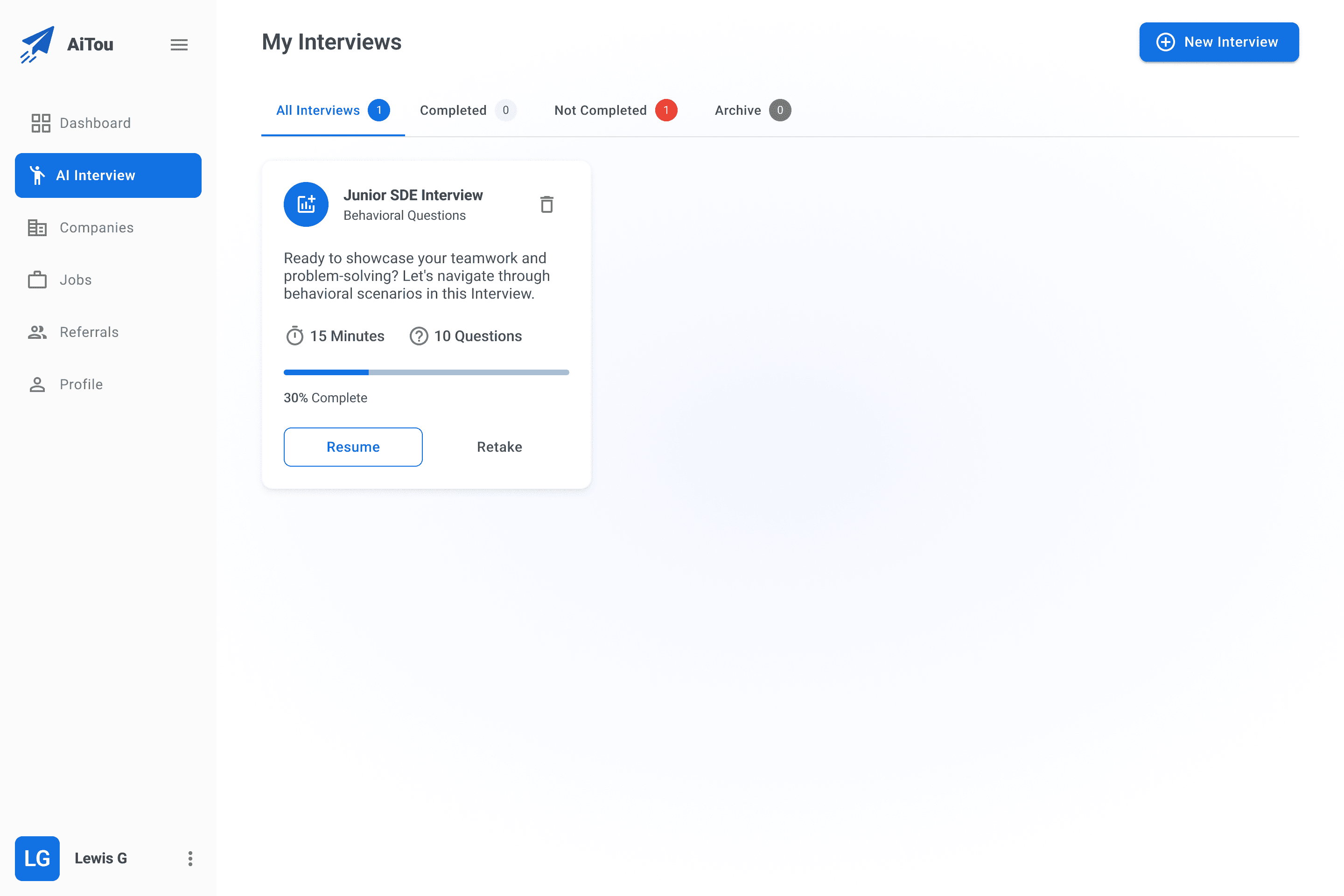 The interview dashboard helps users manage sessions over time, resume unfinished interviews, and build consistent practice habits instead of starting from scratch.