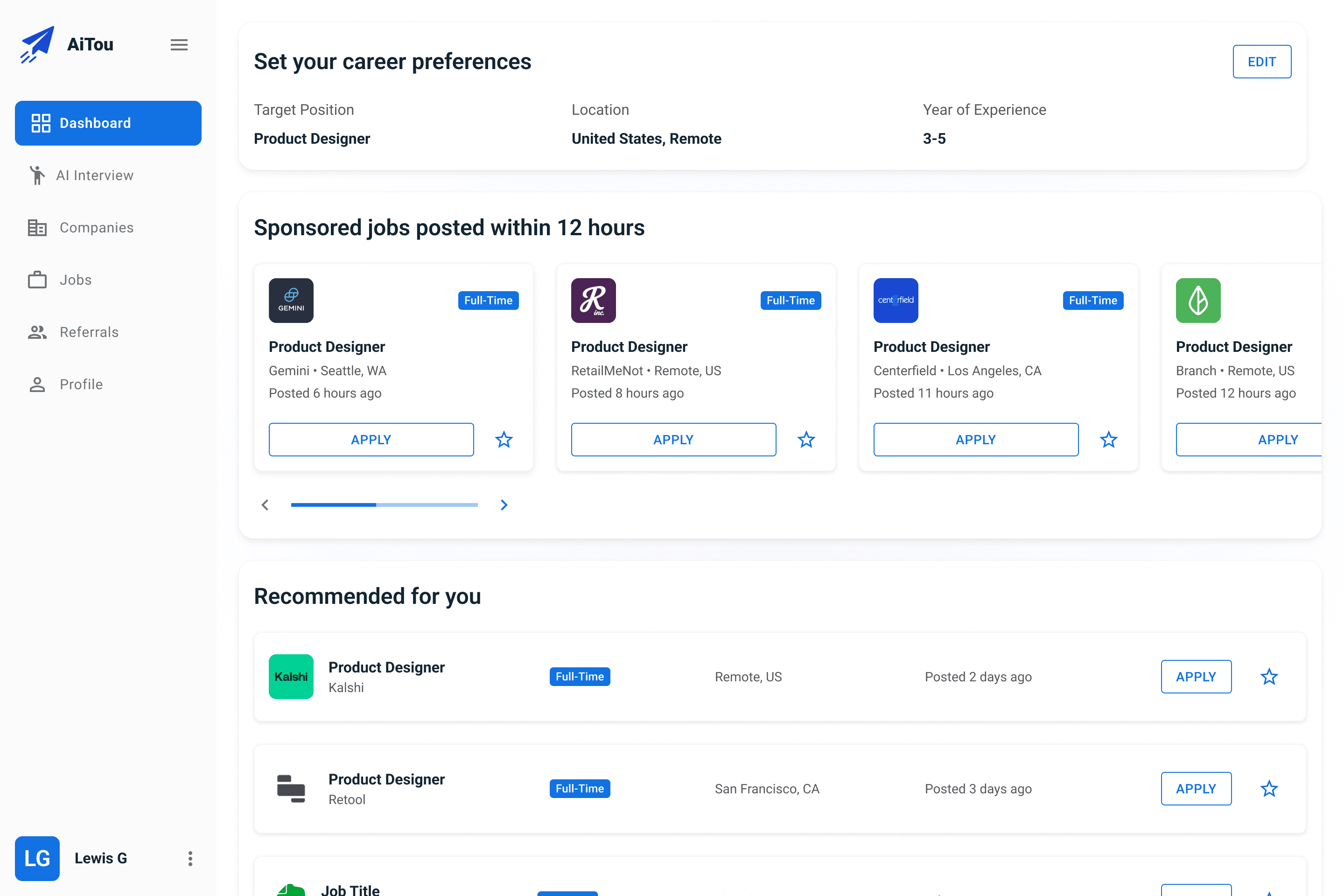 The dashboard highlights new opportunities based on user preferences, helping candidates act quickly and focus on roles that matter most.