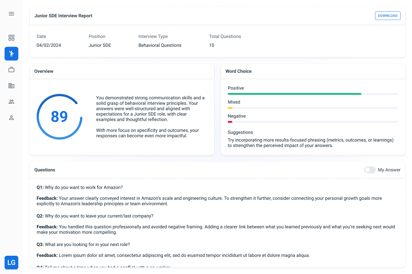 By adapting to each user’s role and performance, the interview assistant delivers targeted questions and feedback at the right time, helping users practice with clarity and purpose.