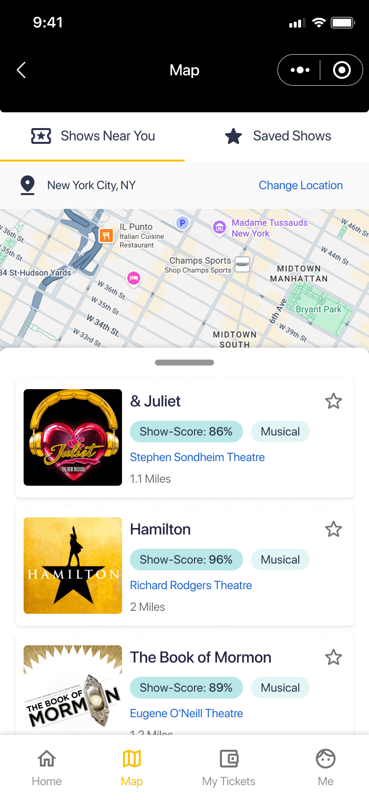 Seamless exploration: Users can browse nearby and saved shows directly from the map, bridging discovery and decision-making without switching contexts.