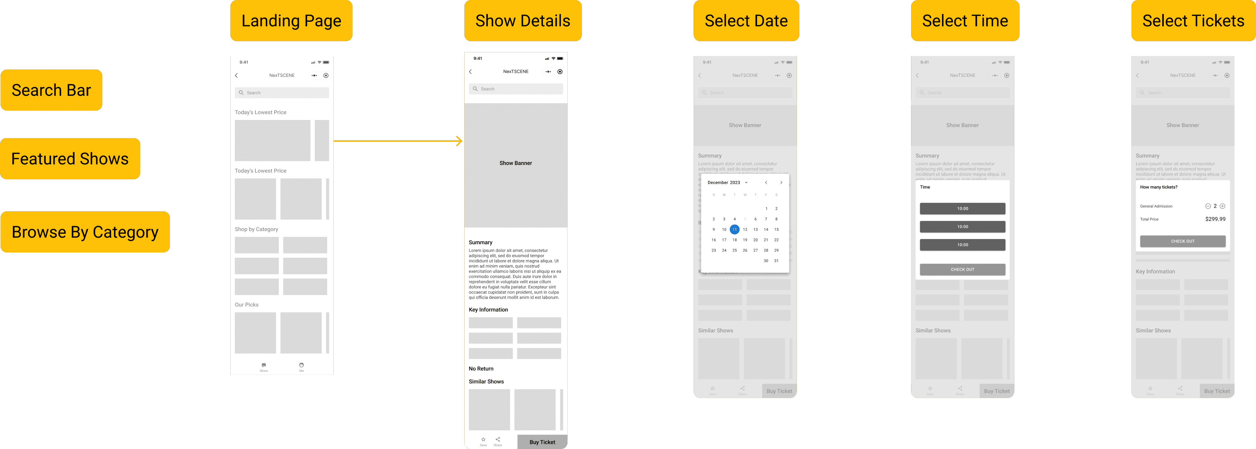 To explore the solution space, I focused on rapid ideation and low-fidelity concepts that emphasized clarity, speed, and ease of purchase. Multiple layout and flow directions were tested to identify the simplest path from show discovery to checkout.