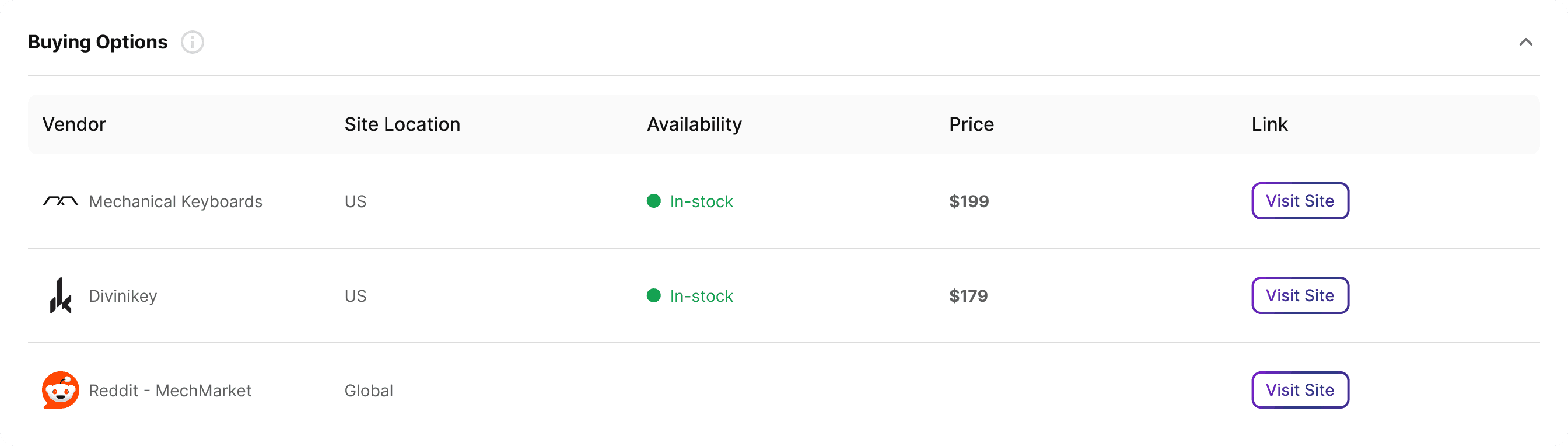 In addition to official retail sites, the system also includes Reddit MechMarket, which is often the only active source for discontinued or limited-run items. Since many keyboards are no longer sold new, MechMarket naturally appears as an option when it is the only place where listings still exist.