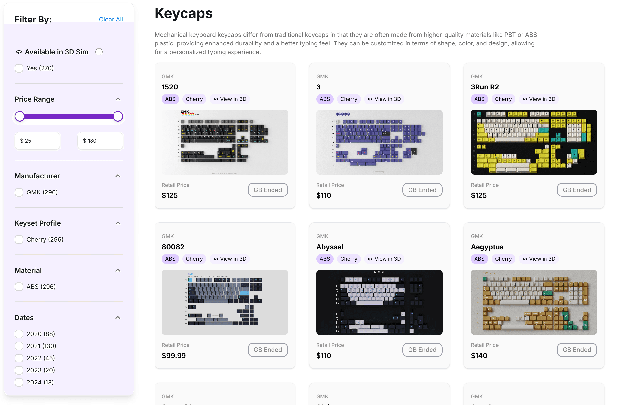 Each keycap set supports detailed filtering by profile, material, release year, and price, with select sets offering a 3D preview to help users better visualize how keycaps look across different layouts.